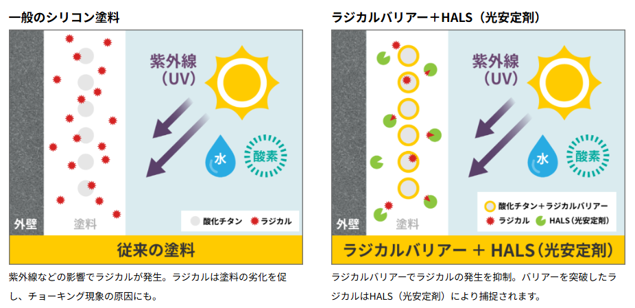 塗料中のラジカル発生を抑え、塗膜劣化要因を軽減する先進技術を採用(仕上がりの耐候性を強化)。