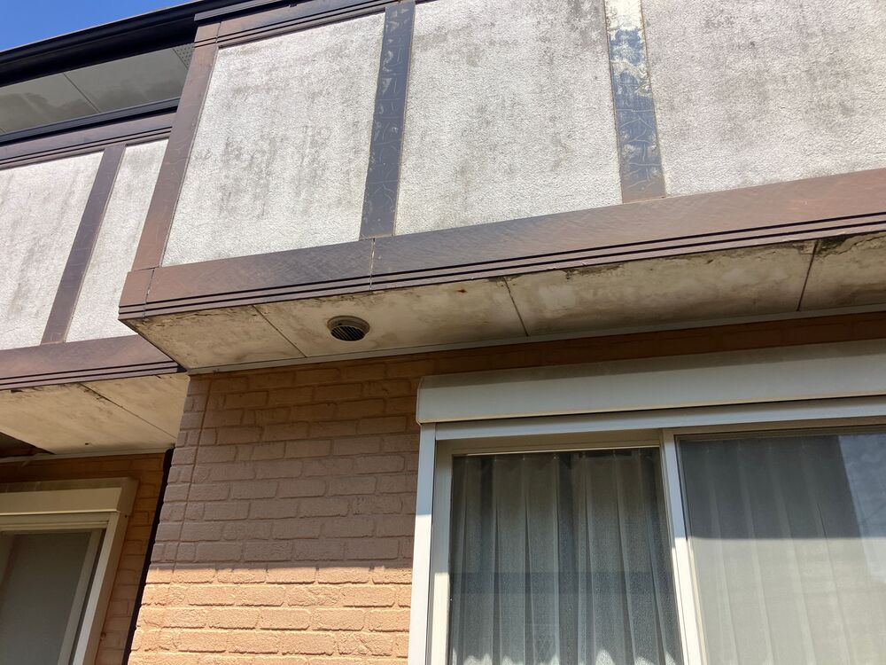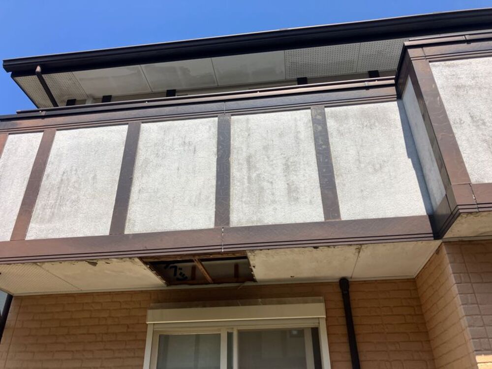 これらの亀裂から雨水が浸入し、下地の木材を腐食させた結果、軒天の一部が落下したものと考えられます。