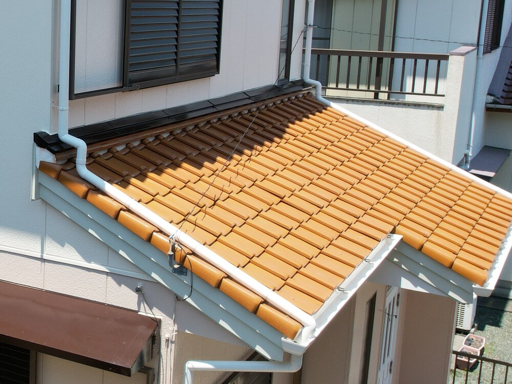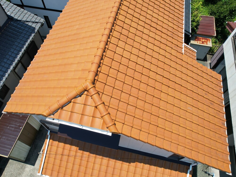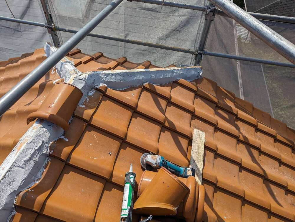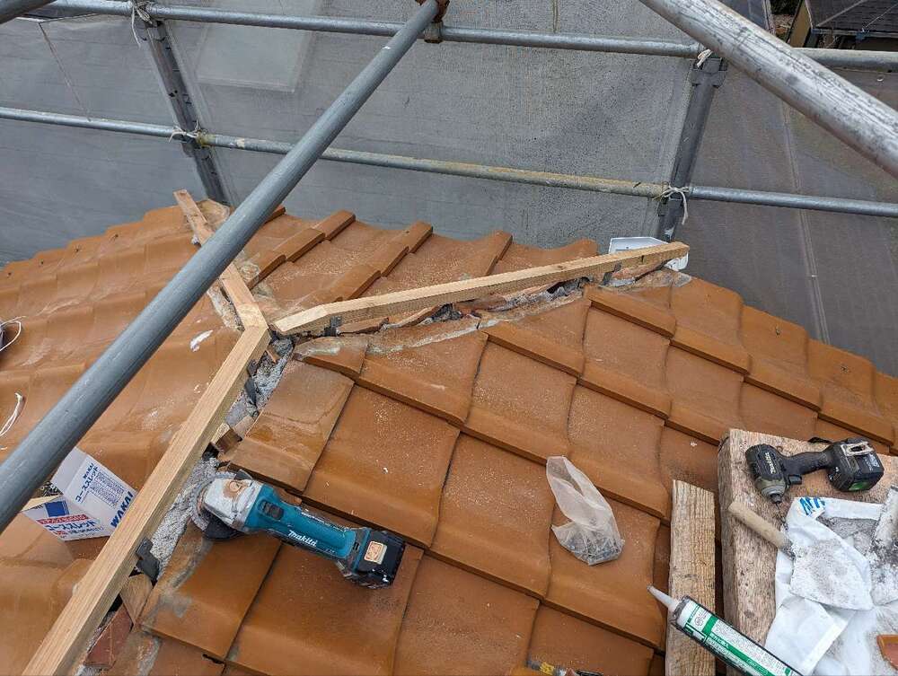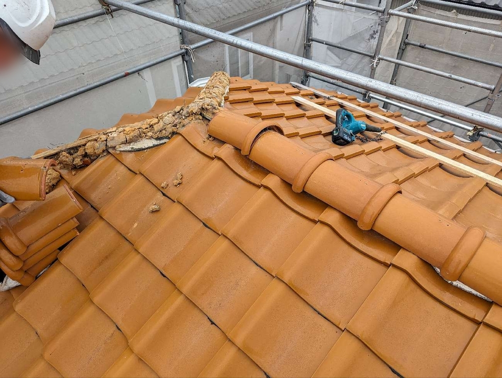 陶器和瓦の本棟、隅棟瓦ズレ補修・軒先板金面戸取り付け・破風、鼻隠し板金巻き