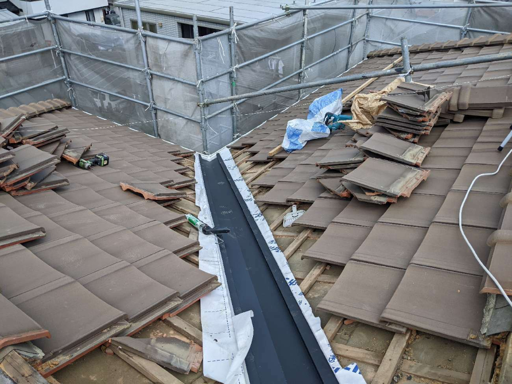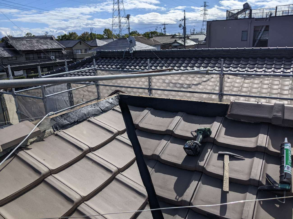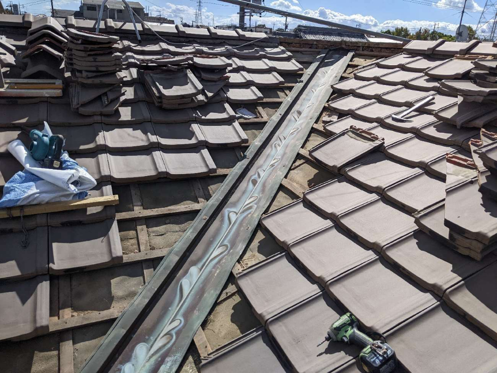 今回、棟部の南蛮漆喰と谷樋の補修を行いました。