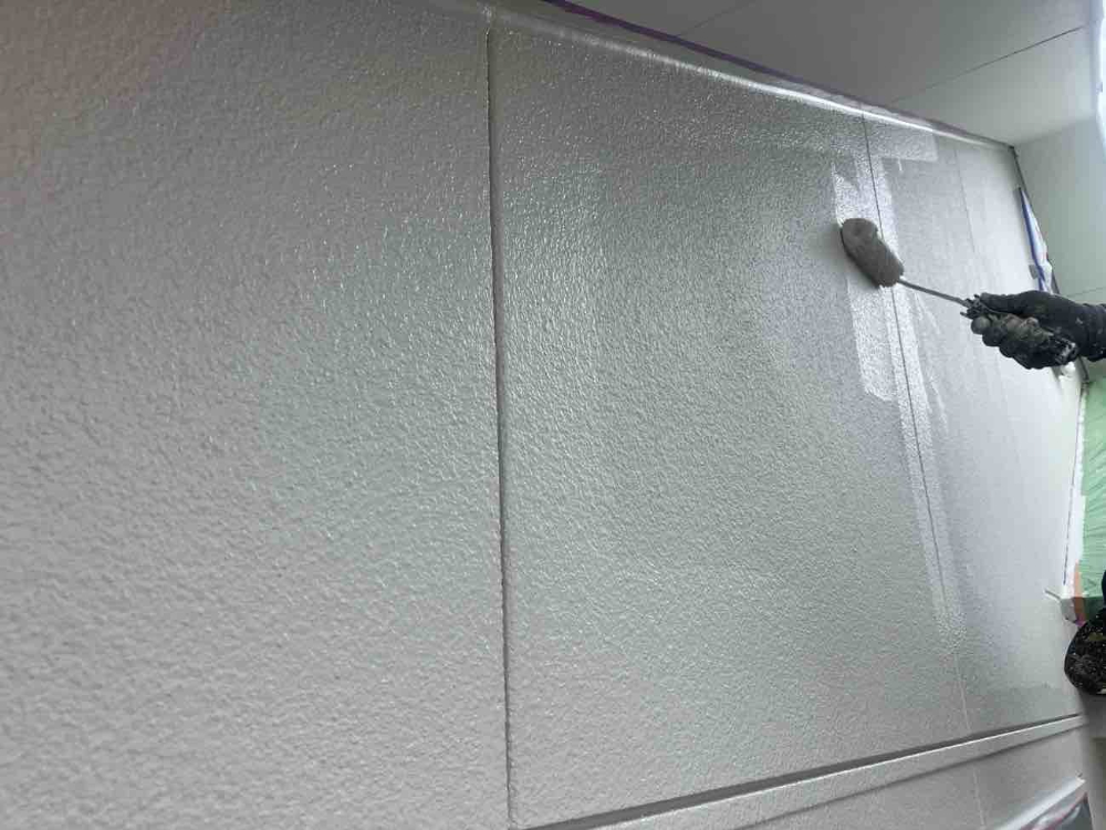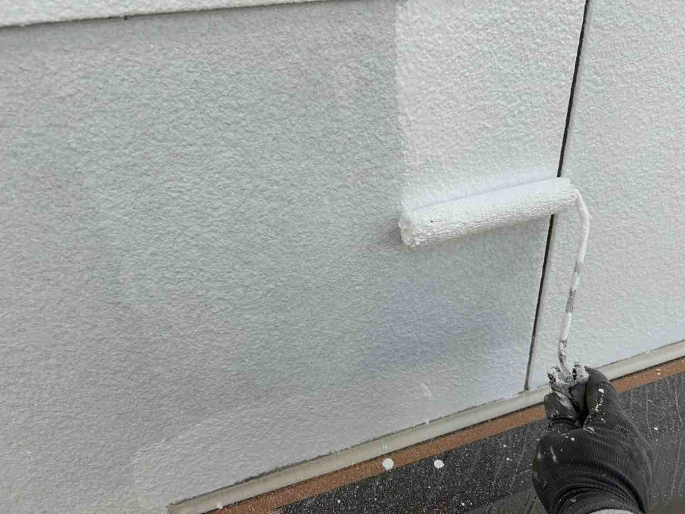外壁に吹き付けられている仕上げの骨材が剥がれ始めていたため、外壁材に浸透して下地を補強するアレスエポレジンを下塗り材として使用しています。