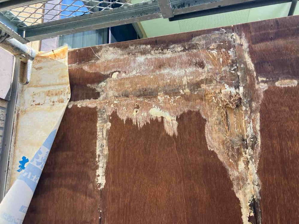 バルコニーに取り付けられている幕板は、笠木よりも手前に突出した構造となっているため、幕板上に水が溜まりやすく、長期間にわたり水分を吸収してしまったものと考えられます。